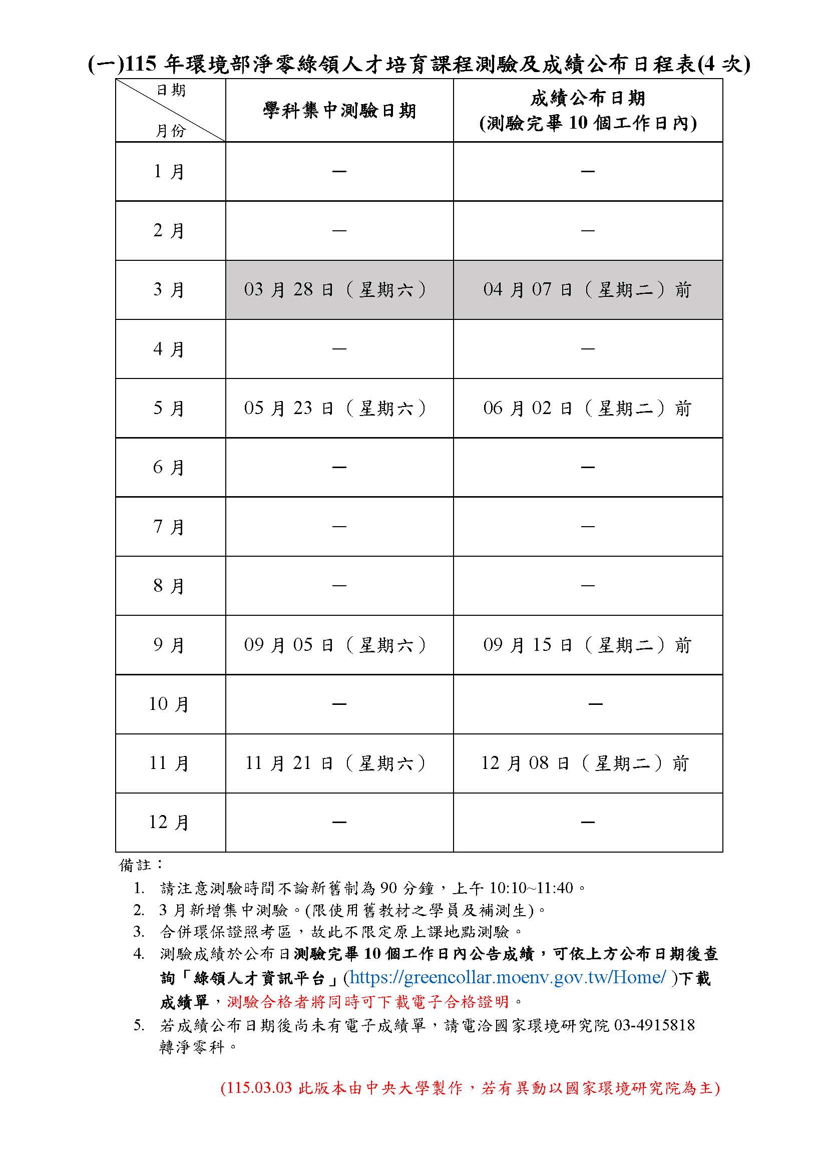 115年淨零綠領人才培育課程集中測驗及成績公布日程表4次 發佈日期:2026-01-30 瀏覽人次:25 資料來源: 友善列印 展開社群分享 分享到臉書 分享到推特 分享給LINE好友 您的瀏覽器不支援JavaScript語法,如需列印網頁內容,請使用鍵盤Ctrl+P即可列印;如需將內容分享到各社群平台網站上,請點選連結進行分享:分享到臉書、分享到Google+、分享到推特 回前一頁 此段 JavaScript 提供回上一頁功能,若瀏覽器不支援 JavaScript,請使用鍵盤 Backspace 或瀏覽器回上一頁功能